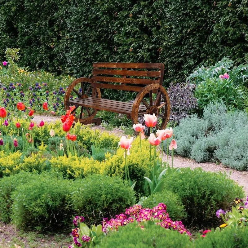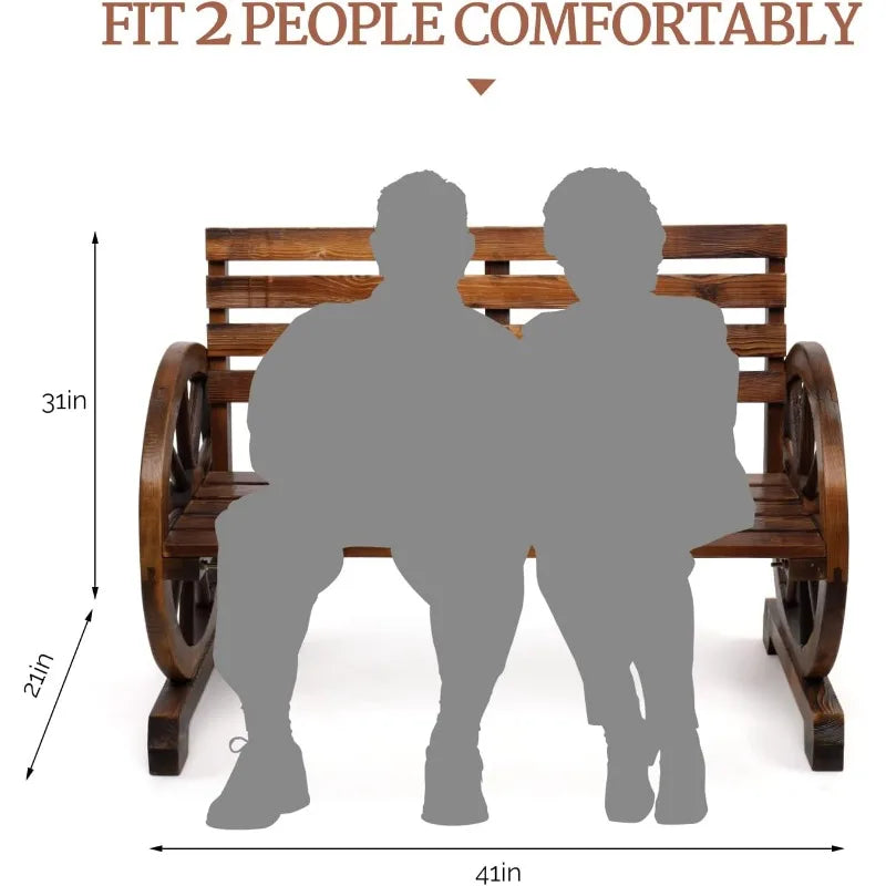 Bring rustic charm to your patio with a sturdy 41" wagon-wheel bench that seats two comfortably and supports up to 350 lbs.